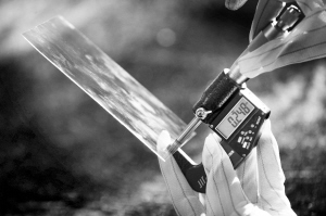 3月24日,在河南洛阳中国洛玻集团龙海电子玻璃有限公司生产车间,工作人员用仪器测量超薄玻璃厚度为0.248毫米。