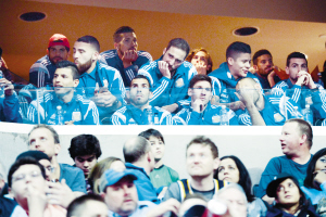 当地时间3月25日,阿根廷足球队球员梅西(前左三)和队友观看奇才队和步行者队的比赛。 当日,在2014-2015赛季NBA常规赛中,华盛顿奇才队主场以101∶103不敌印第安纳步行者队。 新华社记者 殷博古 摄