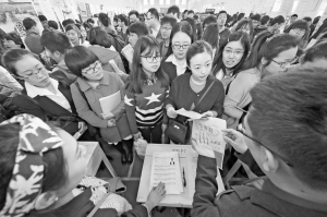 3月29日,毕业生在招聘会上求职。当日,山东省2015年师范类高校毕业生供需见面会在烟台市鲁东大学举行,280多家用人单位提供了3000多个就业岗位,吸引众多毕业生前来求职。