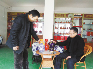 近两年,受政策影响,白酒销售遭遇寒冬,但大坛酒却逆势而上。3斤装、5斤装,甚至10斤装的坛装酒均受到众多消费者热捧。一些专家认为,坛装酒具有原浆高度酒、传统渠道少见等特点,满足了中产阶级“少喝酒、喝好酒”的需求,市场潜力很大。图为河南万姓缘酒业两位技术人员在商讨大坛酒的包装设计。