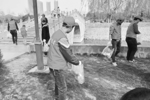 3月29日,商水县阳城志愿者协会组织志愿者在阳城公园清理垃圾,用实际行动向“白色污染”宣战。晚报记者 马治卫 通讯员 李春杰 摄