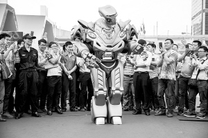 3月31日,在深圳会展中心广场,机器人泰坦与观众互动。