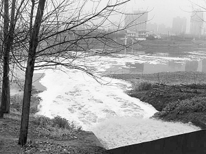 当日上午,记者在现场看到,一个排污口“张着大嘴”向沙颍河喷吐着黄色的污水(如图)。污水淌进沙颍河后,很快将附近的河水污染成淡黄色,并散发出难闻的气味。附近居民说,这个排污口已经存在一年多了,不知道这污水来自哪里,更不知道排放的是什么污水。每当有污水排出的时候,他们大老远就能闻到一股刺鼻的味道,离近了的话,那酸臭味能熏得人流眼泪。