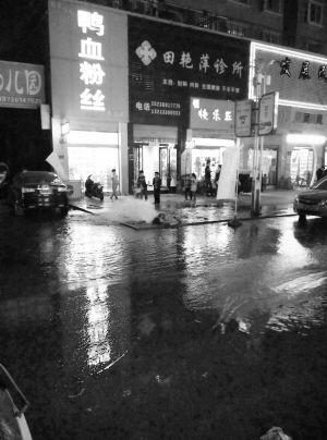 3月31日18时许,周口市区育新商业街上的一个消火栓被一辆轿车撞断,自来水喷涌而出,马路上很快水流成“河”。当日19时许,维修人员赶到后,关闭了相关阀门,大水渐渐消退。晚报记者 朱东一 摄