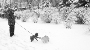 4月2日,内蒙古赤峰市克什克腾旗一名市民在雪中遛狗。