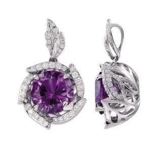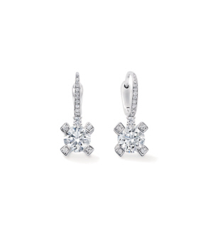 简洁的做法,则是如Forevermark R永恒印记的拥诺系列,只是在中央一颗大钻石的周围,将四个托爪也镶上钻,做法简单,但立刻便有了简洁的花形,不再只是一颗单钻耳钉那样单调。