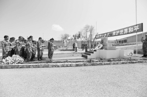 4月5日,中国维和官兵在纪念碑前脱帽默哀。
