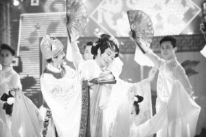 一向在表演中威严十足的特型演员刘劲,这次竟穿上女装反串起了杨贵妃,和反串唐明皇的妻子胡艳萍一同演绎了一首经典的《贵妃醉酒》。