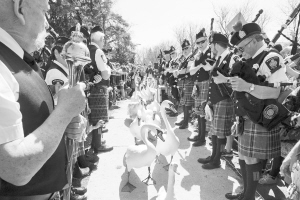 4月12日,在加拿大安大略省斯特拉特福德,一群天鹅在乐队及游人的注视下走在街道上。