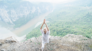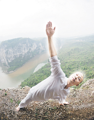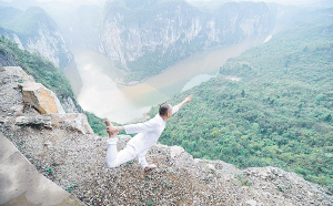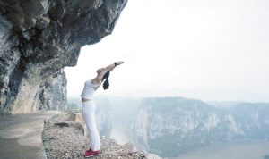 2015年03月31日,湖南省张家界市,瑜伽爱好者在湖南省张家界市茅岩河大峡谷的万丈深渊边上演高空极限瑜伽,惊险的瑜伽练习令人心惊肉跳,瑜伽爱好者从容淡定地体验高空极限的刺激感觉和“一览众山小”的自然情怀。