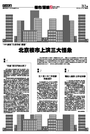 “良心开发商 新政之下不涨价”、“调涨倒计时48小时”……随着3月30日新政落地,各大开发商吃准了购房者怕涨价的心理,借机大打价格战。沉寂有段时间的项目也乘机改变策略广做宣传,想快速清盘。4月8日,北京晨报记者调查发现,这一次迎来的政策红利却与2008年底出现了大相径庭的市场现象:有的在售项目虽然还未涨价,就拿出“囤货”来卖;二手房市场,也仅是3至5年受益的二手房卖家,有积极涨价的心态;看房的人多了,但是追涨加价的买房人却少了……楼市正在上演有史以来难得一见的三大怪象。