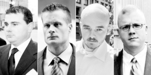 美国地区法官罗伊斯·兰伯思4月13日宣判,被判一级谋杀罪的原“黑水”雇员尼古拉斯·斯莱顿(下图左三)获刑终身监禁,他被指证为率先开枪射杀伊拉克平民;针对另外3名被判故意杀人罪、杀人未遂罪和滥用枪支罪的原“黑水”雇员,即保罗·斯劳、埃文·利伯蒂和达斯廷·赫德,兰伯思判处他们监禁30年零一天。