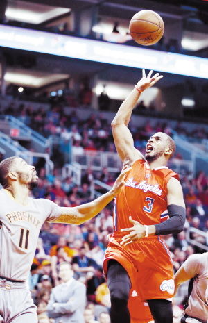 当地时间4月14日,快船队球员保罗(右)在比赛中投篮。当日,在2014/2015赛季NBA常规赛中,洛杉矶快船队客场以112∶101战胜菲尼克斯太阳队。新华社发