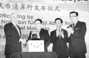 4月14日,在马来西亚普特拉贾亚,马来西亚总理纳吉布、中国银行行长陈四清、中国驻马来西亚大使黄惠康和马来西亚交通部长廖中莱(从左至右)出席马来西亚人民币清算行启动仪式。