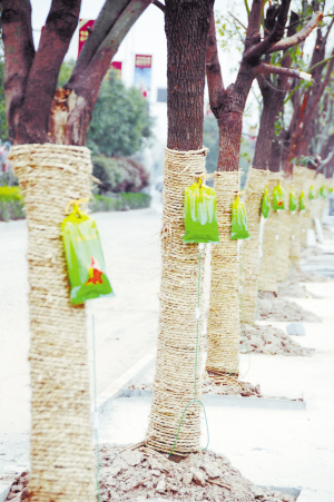 行道树集体“打点滴”,是生病了,还是有别的原因?当日上午,记者来到周口大道与庆丰路交叉口,看到路旁几十棵新种植的小树全部挂上了绿色吊瓶(如图),上面写着“大树AG营养针液”。绿化工人在树干上钻一个小洞,然后把营养液的软管放在里边。扎针、绑胶带、调节输液器,小树像极了病人。