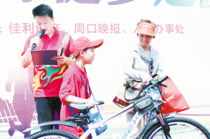 返回目的地佳利地产营销中心后,小记者与所有方队共同参加了抽奖活动,山地车、空气加湿器、篮球、跳绳、握力器等,丰厚的奖品让每个小记者都跃跃欲试。当最大的奖项——山地车被一名小记者领走时(如左下图),现场响起了热烈的掌声。