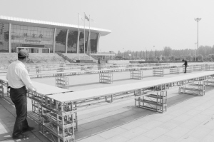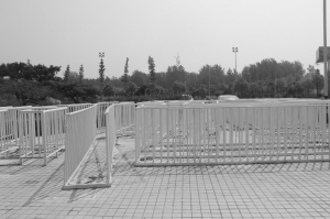 据悉,这些铁架将于5月1日摆放鲜花,预计4月29日会完成这项工作。在广场东侧,一些护栏也整齐地摆放在一起(小图)。届时,这些护栏将被放在开幕式会场入口处,以方便市民有序进入会场。晚报记者 王凯 摄