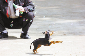 忽然,不远处的一只小狗飞奔过来,显然它也发现了飞落的泡泡。小女孩见此情景,停下了脚步,索性停在原地看小狗追赶泡泡……晚报记者 金月全 摄