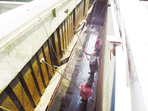 天气渐渐炎热,为进一步提高供水水质、水压,保障全市饮水卫生安全,让市民喝上干净水和放心水,连日来,周口银龙水务有限公司加班加点,对二水厂的供水设备——沉淀池和蓄水池等进行了全面清洗、消毒。图为银龙工作人员刷洗沉淀池。晚报记者 彭慧 通讯员 卢海洋 摄