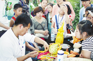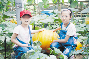 午餐后,小记者乘车赶至位于郑州中牟县雁鸣湖风景区附近的国家农业公园。因为正赶上中牟国家农业公园第二届农业嘉年华,所展示的现代农业成果美不胜收。随着讲解员的解说,小记者领略了现代农业的神奇。在欢乐农庄馆,好奇的小记者切身感受到多种特殊的种植技术。用一个个小南瓜串成巨型玉米;用16000头大蒜、50斤银耳制作成别具一格的大蘑菇;用各种粮食作物种子制成农耕之魂雕塑、五谷丰登雕塑;用5吨生姜组成“姜山多娇”;用花卉组成“和谐共生”等景观雕塑……让人目不暇接。参观队伍中不时发出“啧啧”的惊叹声,有的小记者连忙用相机、摄像机记录下美不胜收的景观。