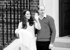 当地时间5月2日,威廉王子(右)和怀抱小公主的凯特王妃在英国伦敦圣玛丽医院门前亮相。英国凯特王妃2日上午在伦敦圣玛丽医院产下一位小公主,为英国王室增添一名新成员。新华社记者 韩岩 摄
