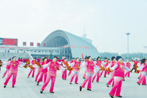 在周口全民健身月启动仪式上,老人在进行秧歌表演。