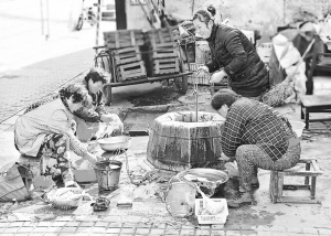 从老水井的遗址分布来看,凿一口井的造价一定不菲,稍富一些的人家虽打不起水井,但也不愿意掏那份苦力,就买水喝。所以“打卖水”便成了活跃于大街小巷的一种营生。卖水时,碰到有洁癖者就坏了事,只肯买前面那桶水,死活不肯要后面那桶,说是怕卖水者放进去了屁。