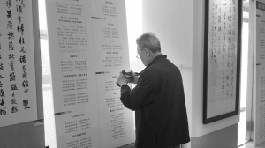 “你看,这次展出的书画作品,真、行、草、隶、篆五体俱全,既有雄强豪放的草书,又有精致典雅的小楷,隶书沉厚,篆书婉通,行书飞动,风格多样,流派纷呈,真不错!”在会展大厅一侧的周口老年人体育诗书画展区,市民刘先生全面欣赏了参展作品后,赞叹不已。展厅内,喜爱书画作品的市民中,有的驻足细细琢磨,并不时发出赞叹之声,有的拿起手中的相机,拍摄下难得的艺术佳作。今年86岁的马怀普(音)老人是周口市诗词学会会员,由于这次参展作品要求内容必须跟体育相关,老人没能提交自己满意的作品,他为此专门拿着相机把展厅里的诗词作品一一拍下,想看看别人的作品都写了什么,好回家学习学习。