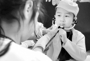 5月6日,在浙江省宁波市镇海区宝山幼儿园的模拟“爱心医院”,一名小男孩当起“医生”,为“患者”看病。