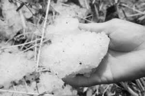 5月7日,河南省平顶山市宝丰县大营镇上李庄村一名农民展示落在田里的冰雹。