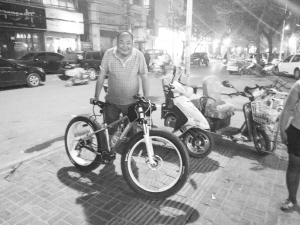 5月6日晚,体重110公斤的市民刘先生骑着一辆超宽轮胎的自行车在周口市区文明中路闲逛,引来不少市民驻足观看。刘先生风趣地对围观市民说:“像我这样的大块头,就需要这种超宽轮胎的自行车。”晚报记者 徐松 摄