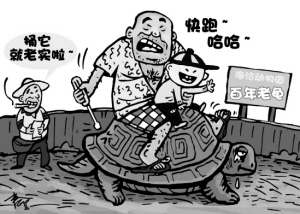 在一般人眼中,乌龟是长寿的象征,以行动缓慢著称。骑着它,既没有骑在大象背上那种高高在上的感觉,也没有骑在马背上那种风驰电掣的刺激感,而且还要用螺丝刀捅几下才走上几步……如此对付一只上百岁的动物,这是多么血腥和残忍。人类经过上万年的摸索,早已总结出一些动物的基本规律,可偏偏有人就喜欢违兽道而行之,如吃虎骑龟……