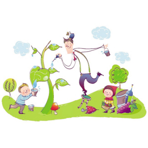 坑挖好后,我把小树苗放到坑里,爸爸给它盖上土。妈妈提来一桶水,慢慢地往树根处浇水。