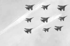 阅兵式最后部分,由米格-29和苏-25战机组成的编队在空中组成“70”的数字图案,象征卫国战争胜利70周年。而由苏-25战机组成的编队在空中拉烟,划出俄罗斯国旗颜色的红白蓝三色烟带……