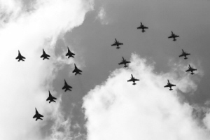 今年阅兵式空中梯队由140多架飞机组成(如图),包括A-50预警机、伊尔-78空中加油机、安-124运输机以及卡-52、米-28N直升机等21种现役航空装备。这些飞机当天分别从12个军用机场起飞,并以规定的速度和高度飞越红场。