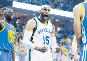 当地时间5月9日,灰熊队球员文斯·卡特(右)在比赛中。当日,在2014-2015赛季NBA季后赛西部半决赛第三场比赛中,孟菲斯灰熊队主场以99∶89战胜金州勇士队,总比分以2∶1领先。新华社发