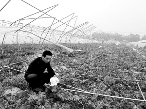 “我们这块地有53个大棚,经过精心管理,这些西瓜5月中旬就可上市。没想到,5月6日晚的那场暴风雨一下子刮倒了26个大棚,另外还有十多个大棚遭到不同程度的损坏,造成的直接经济损失达上百万元。”李金磊说。