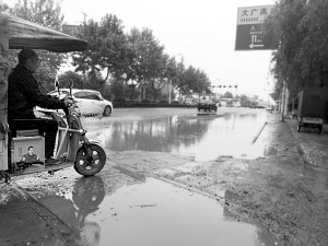 由于几天前的那场大雨,这几天周口市区交通大道东段周口东郊国家粮食储备库附近再现大小水坑。5月8日,记者在现场看到,不少过往车辆和行人路过此处时纷纷选择绕路或减速慢行。据了解,尽管此段道路路面每年都会被修补,但不多久路面又会变得坑坑洼洼。