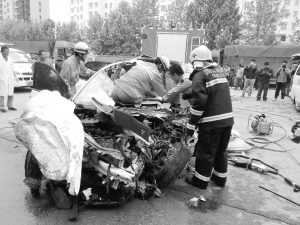 一位目击者告诉记者,那辆小轿车当时跑得很快,从路北侧车道斜着跑到路南侧撞上大货车。小轿车内有一男二女。前座二人均系着安全带,被困在车内。后座的女士没有系安全带,被从前挡风玻璃处甩出车外,头部受伤严重。120第一时间赶到现场,把受伤最重的女士拉走抢救。记者了解到,该女士经抢救无效死亡。随后,交警和消防官兵先后赶到。