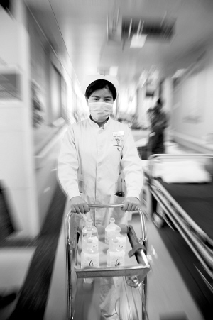 王东霞每天7时30分就会赶到血液科。这是她的习惯,在8时医护大交班之前到达岗位,为一天的工作做好准备。整理床铺、准备针剂药品、扎针输液、心理安抚,也是她每天默默无闻做的“平常事”。