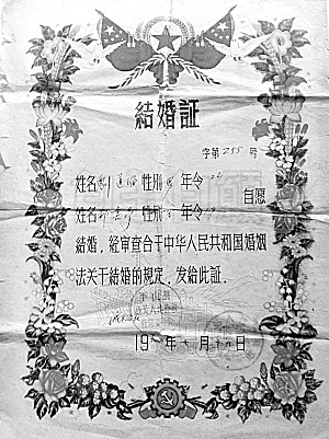 我和老伴1961年8月1日喜结良缘,那时正是困难时期,市场物资奇缺而且特别贵。因家里穷得叮当响,双方商定婚事一切从简。我给了她一块上衣布料算是“彩礼”,她带上自己的被褥算做“陪嫁”,托关系买了一条阿尔巴尼亚香烟和2斤古巴水果糖,在机关举行了一个走过场式的婚礼,我们就算完婚了。婚礼看似像儿时玩“过家家”一样简单,全凭一张花了四角钱领回的结婚证,是它让我俩成了底气十足的正式夫妻。