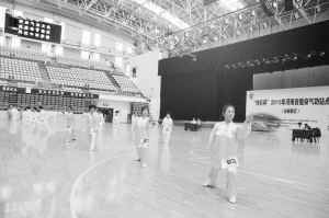 本报讯 5月13日至14日,由河南省健身气功管理中心、省健身气功协会主办,周口市体育局、市体育总会承办的“体彩杯”2015年河南省健身气功站点联赛东部赛区的比赛在周口市体育馆举行(如图),共有来自4个省辖市、4个省直管县(市)的32支代表队参加,其中周口参赛队6支。