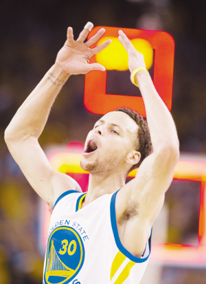 当地时间5月13日,勇士队球员库里庆祝得分。当日,在2014-2015赛季NBA季后赛西部半决赛第五场比赛中,金州勇士队主场以98∶78战胜孟菲斯灰熊队,总比分以3∶2领先。