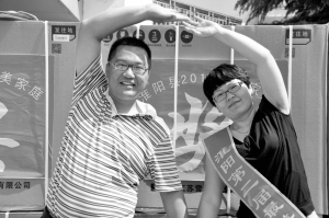 5月19日上午,在淮阳县2015年度“最美家庭”表彰大会现场,一对受表彰的夫妻在奖品前秀恩爱。