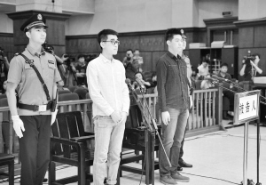 5月21日,被告人唐某某、于某某(左二)在法庭上。