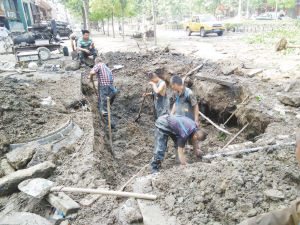 由于水管爆裂处地下电线管网比较复杂,8位施工人员没有使用机械挖,而是用铁锹。“这里的管网比较粗,现在我们已经关掉水闸,可能会造成市区大面积停水。”一位工人说,他们会尽快完成抢修。