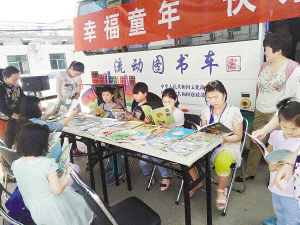 5月23日,小朋友在流动图书车前阅读图书。记者在现场看到,流动图书车内配有阅读书架,还有电视、空调、电脑等设备。商水县文化馆负责人费若云介绍,流动图书车价值20多万元。今后他们会将流动图书车开到学校、社区,以满足普通群众的读书需求。
