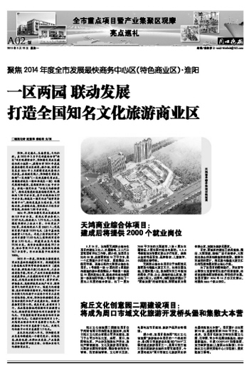 淮阳,历史悠久,生态秀美,文化灿烂。在2015年5月中旬开展的全市“两区”项目观摩活动中,淮阳特色商业区建设位列小组第一,获得全市2014年度发展最快特色商业区殊荣。据介绍,该商业区是在2014年3月获得省发改委的正式批复。在规划范围上,淮阳特色商务区按照“一区两园”(一区就是特色商业区,两园指老城区一园和西城区一园)的模式规划和建设,总规划面积2.36平方公里。老城一园定位为“古城文化旅游景区”,指的是陈楚故城原城墙范围内,面积约1.28平方公里,其中水域面积0.37平方公里;西城区一园定位为“城市商务休闲中心”,指的是羲皇大道以东,文明路以西,五彩路以南,清风路以北的长方形区域,面积约1.08平方公里。