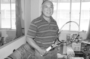 采访中,张厚山拿出儿子刚给他买的一个新网球拍(如图),笑着说:“刚打网球那会儿,我用的是300块钱一个的球拍,现在球技练得差不多了,儿子就花了1000多块钱给我买了一个新球拍,老伴也支持我打网球。”