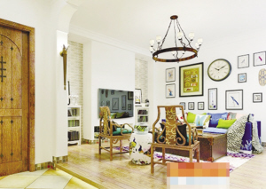 客厅里既有东南亚孔雀腰鼓凳,也有中式的图案挂件,还有中亚地区的地毯及布艺沙发。